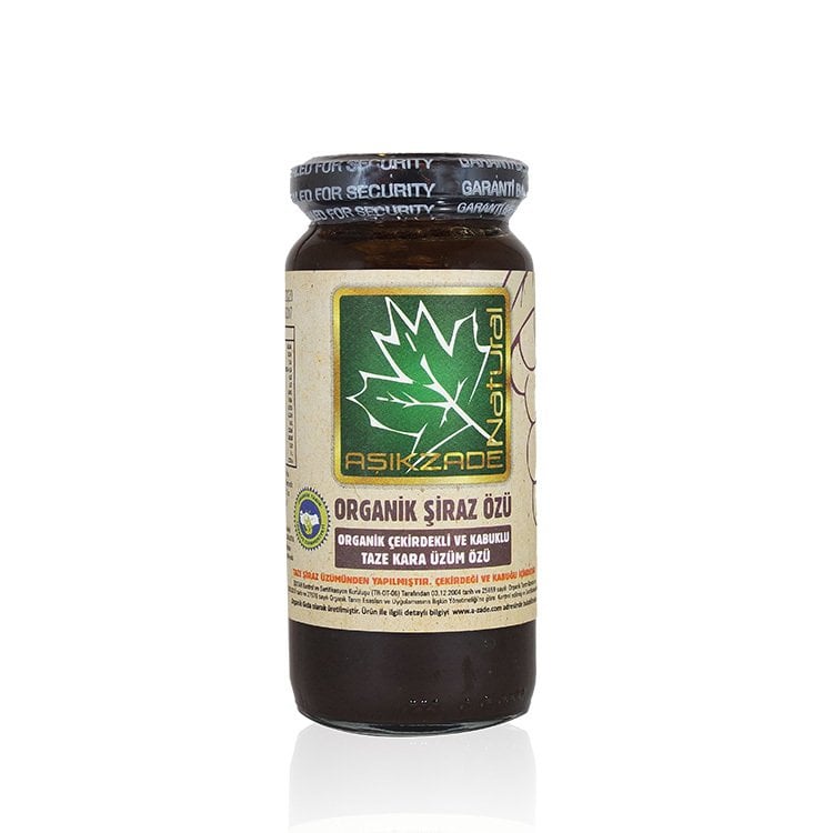 Aşıkzade Natural Organik Şiraz Üzümü Özü 300 grSYRAH ( ŞİRAZ ) cinsi üzüm fidanlarının Tarım Bakanlığı ve Sertifiker Kuruluş denetiminde ORGANİK TARIM esaslarına göre, Battalgazi / Malatya da yetiştirilen ORGANİK bağlarımızdaki Siyah / Kara Üzümlerimizin özenle özel yöntemlerle işlenmesi sonucu üretilmiştir. Ticari formu 300 gr lık cam kavanozlardan oluşmaktadır. Bir kavanoz içerisinde sadece8 kg SYRAH (ŞİRAZ) cinsi üzüm den oluşan 8 kg KARA ÜZÜM vardır. Taze şırasında litre de 8~12 mg, taze kabuğunun gramında ise 60~80 mg arasında resveratrol bulundurur. Ürünümüz olan Çekirdekli ve kabuklu kara üzüm özü nün bir kavanozu (300 gr) 8kg Taze Syrah ( Şiraz ) üzümünden çekirdeği ve kabuğu ile elde edilmektedir.BHKMV579